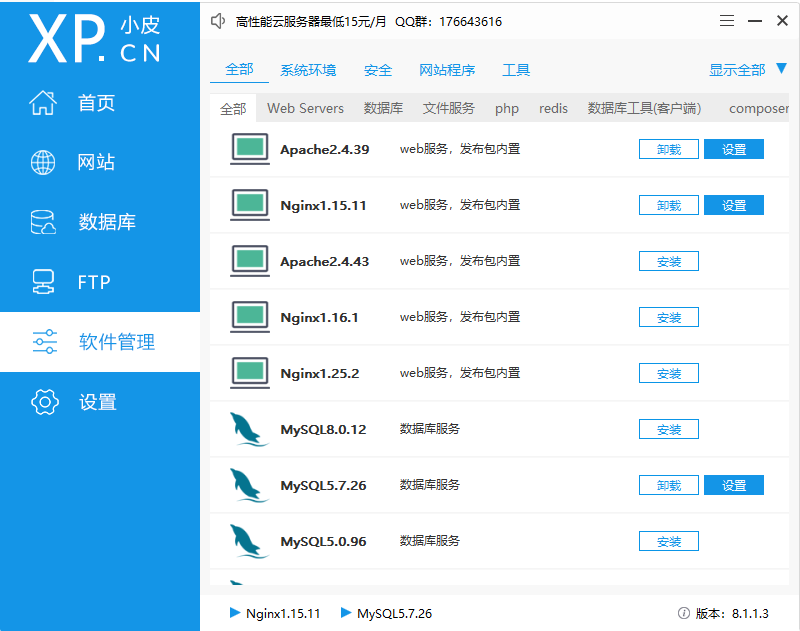 安装并启动 PhpStudy 后,进入【软件管理】界面,安装以下核心组件: