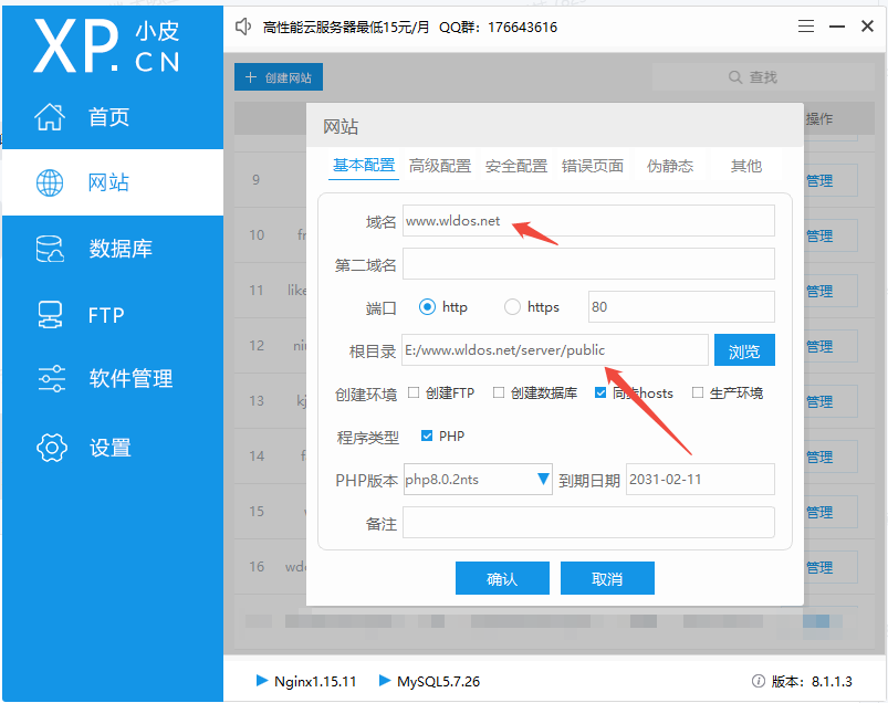 public文件夹(例如E:/www.wldos.net/server/public) - PHP 版本:选择